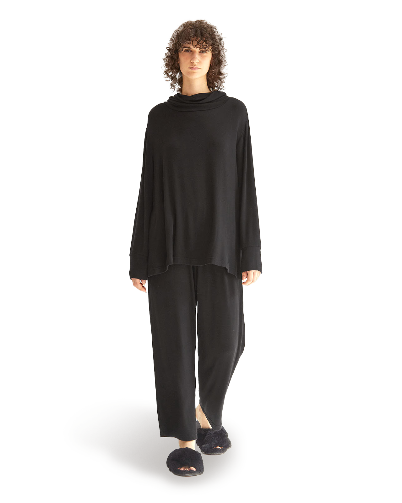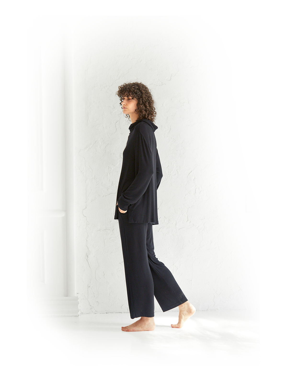 なめらかな落ち感と上品な光沢感で、大人のリラックスタイムをワンランク上の心地よさへ。 程よいストレッチ性も備えているため、ゆったりとしたシルエットながらも動きやすさを叶えます。
