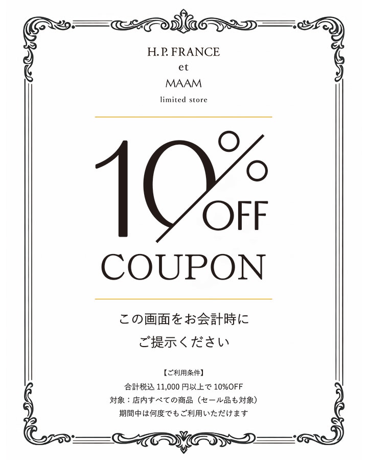 セールを含め合計税込11,000円以上のお会計で、すべての商品が10%OFFとなります。